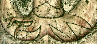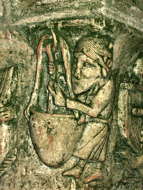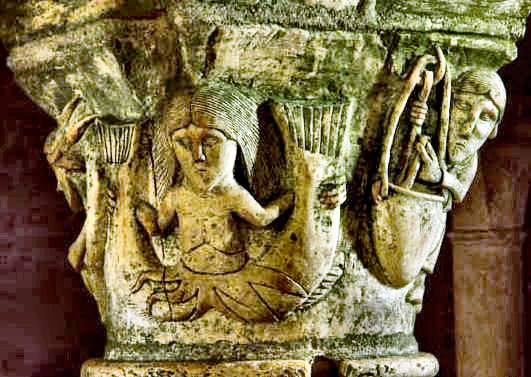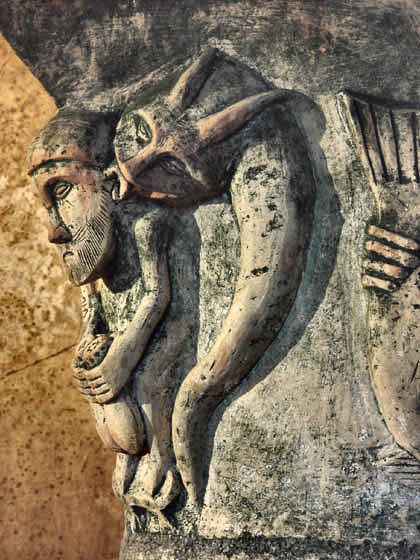L'Avare, un des péchés capitaux est ici représenté sur l'angle de ce chapiteau par un homme tenant serré contre ses jambes deux sacs d'argent tenu par ses deux mains. Il est coiffé d'un bonnet et a une grande barbe, il s'agit certainement d'un usurier.