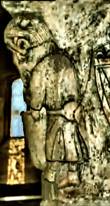 Sur son pagne vous voyez d'une part qu'il cache bien son sexe, d'autre part qu'il présente deux côtés différents. A gauche (donc à sa droite) des rayons ondoyants qui représentent le Soleil et sa chaleur. A droite (donc à sa gauche) des rayons droits qui représentent la Lune et le froid.