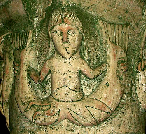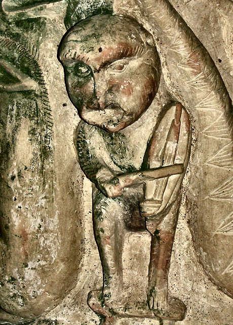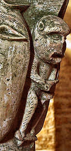 Le singe jouant un genre de vièle (l'instrument n'est pas bien reproduit) n'est pas souvent représenté, mais c'est bien un singe, vous pouvez voir sur la vue de droite que le sculpteur a représenté les poils et les petites oreilles.