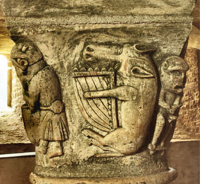 Dans l'art roman il existe de nombreux animaux musiciens, mais le plus fréquent c'est lâne. Cet âne musicien est représenté dans la littérature depuis fort longtemps, il nous semble que la première source est une fable de Phèdre (Ier siècleAP) l'Ane et la lyre.