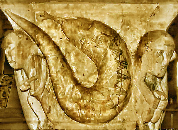 Ses jambes sont des poissons qui évidemment vivent dans l'eau. Le poisson est le symbole christologique de préférence. On pourrait donc voir une allusion au baptême. Né de l'eau du baptême, le chrétien est comparable à un petit poisson, à l'image du Christ Lui-même.